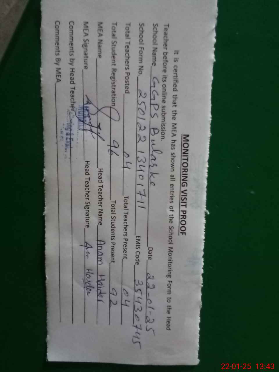 | Attendance Register | Head Teacher | MEA with School | Visit Proof |