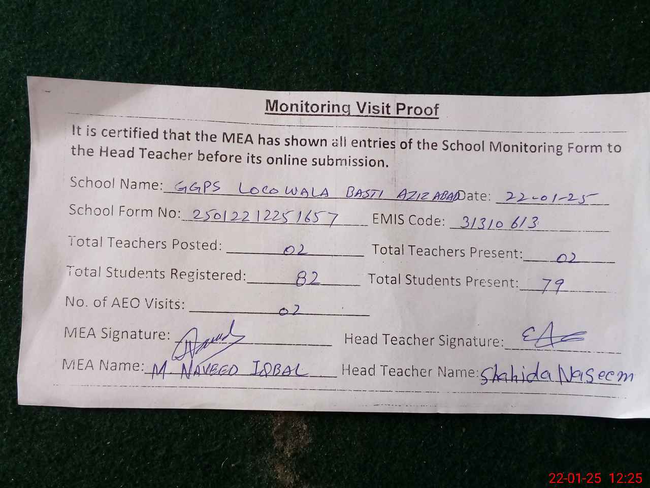 | Attendance Register | Head Teacher | MEA with School | Visit Proof |