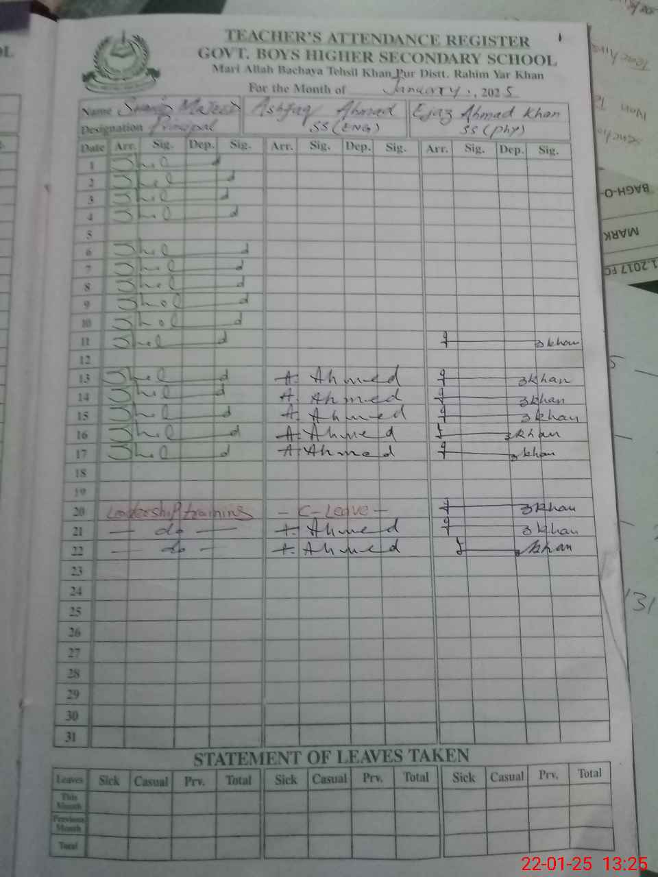 | CNIC | Full Name | Designation | R/C | Absence During Last Calender Month |