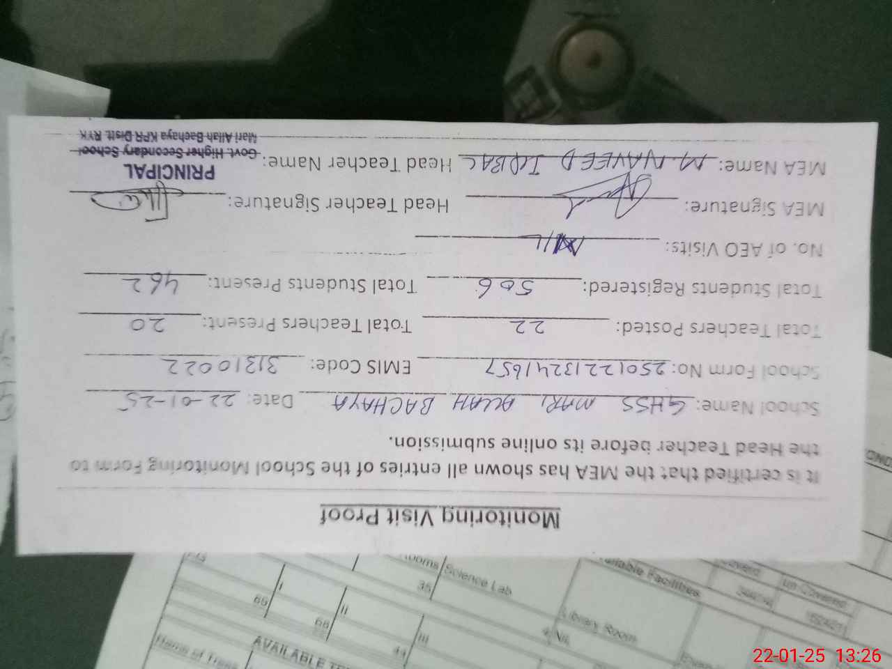 | Certified that this School was Inspected by the Undersigned MEA/DMO Today and the Information Stated Above is as Per Record. | |||||