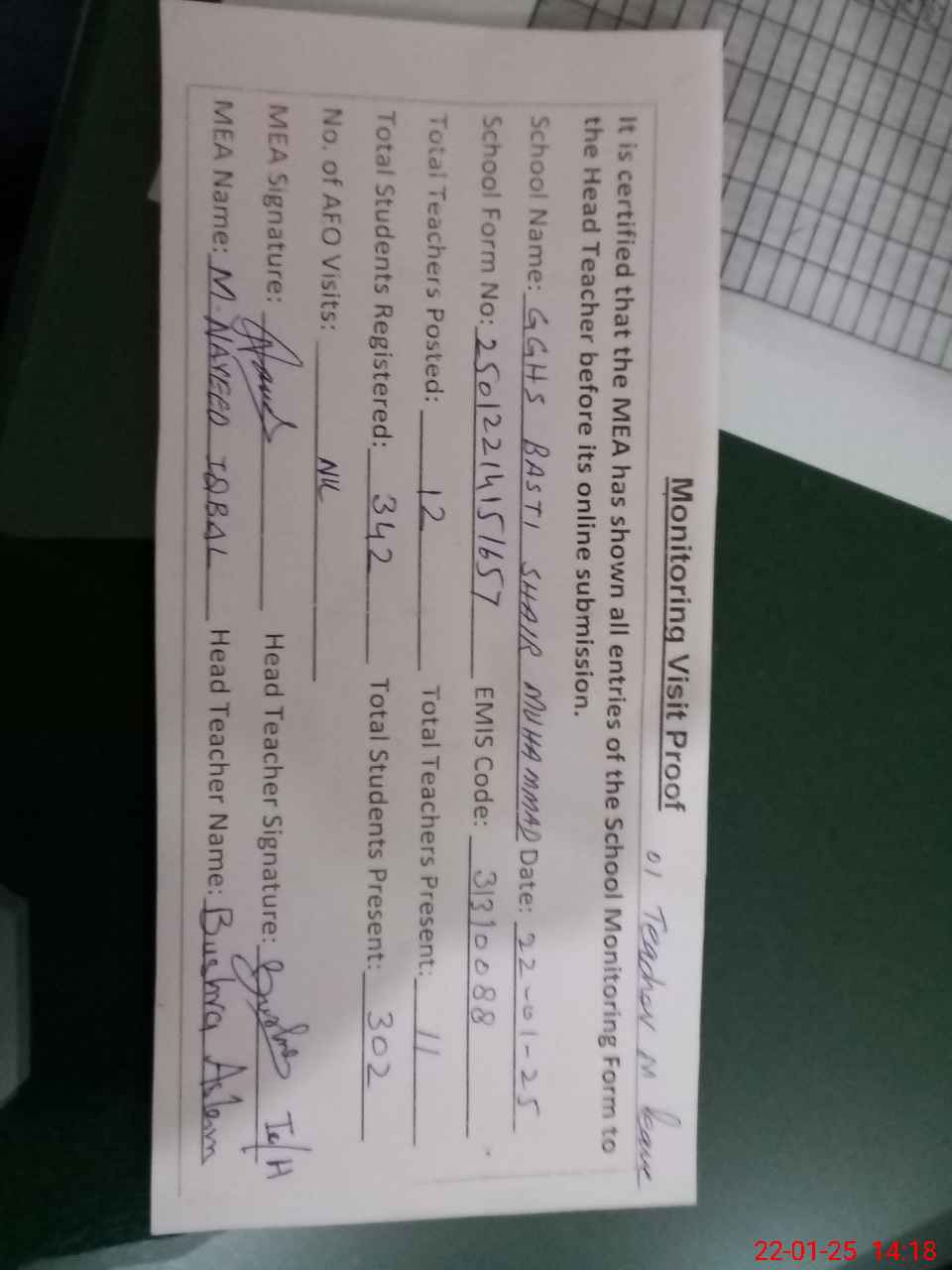 | Attendance Register | Head Teacher | MEA with School | Visit Proof |