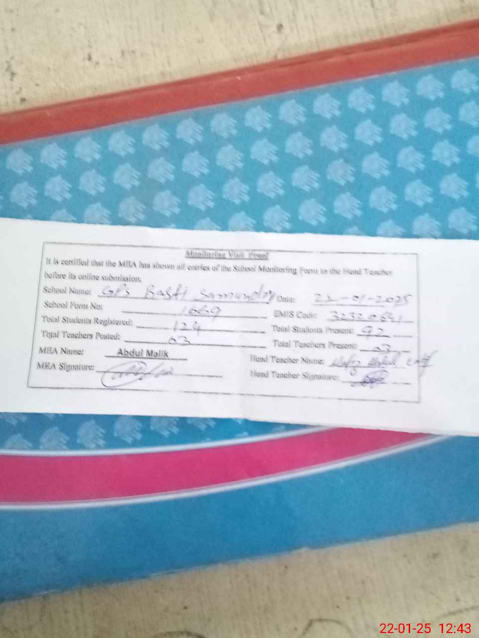 | Attendance Register | Head Teacher | MEA with School | Visit Proof |