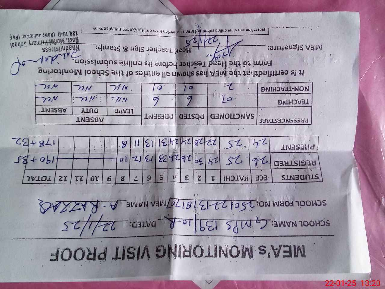 | Attendance Register | Head Teacher | MEA with School | Visit Proof |