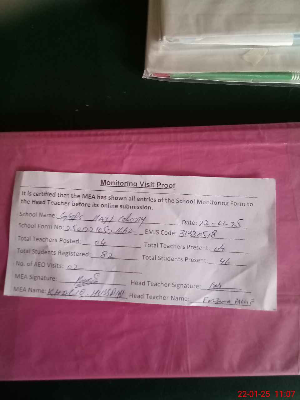 | Attendance Register | Head Teacher | MEA with School | Visit Proof |