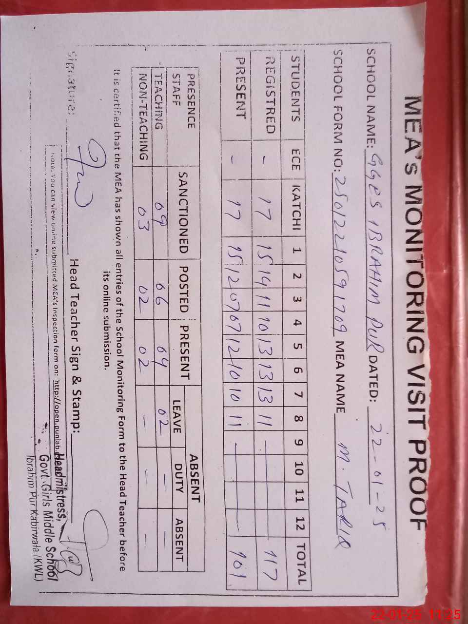 | Attendance Register | Head Teacher | MEA with School | Visit Proof |