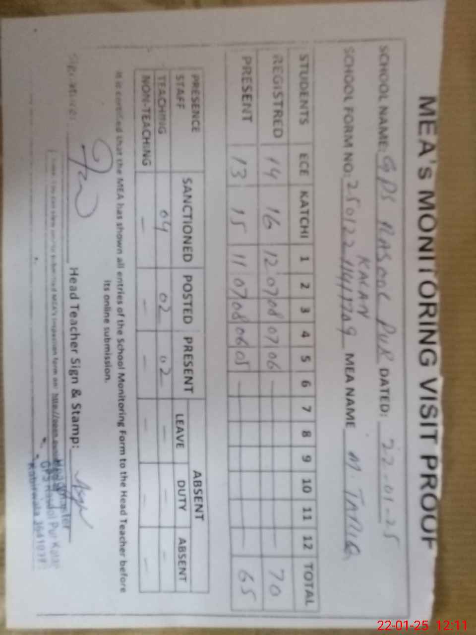 | Attendance Register | Head Teacher | MEA with School | Visit Proof |
