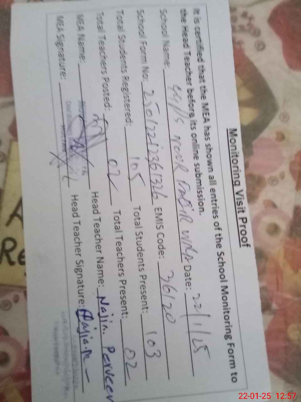 | Attendance Register | Head Teacher | MEA with School | Visit Proof |