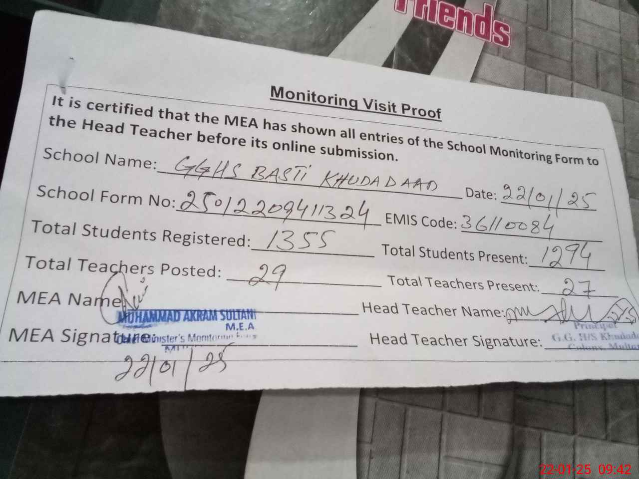 | Attendance Register | Head Teacher | MEA with School | Visit Proof |