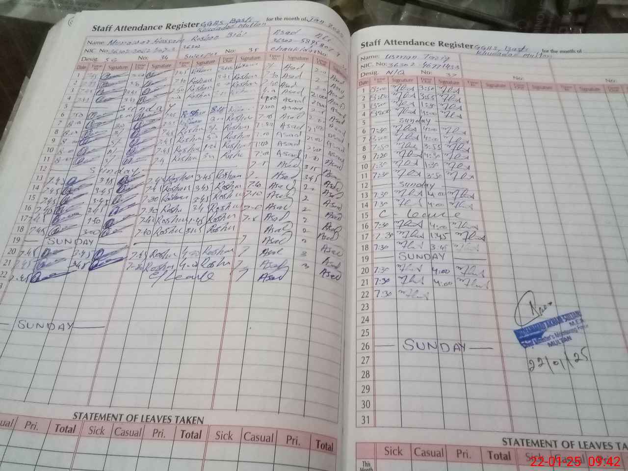 | CNIC | Full Name | Designation | R/C | Absence during last cal. month |