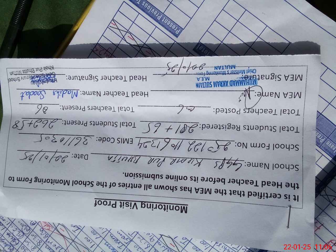 | Attendance Register | Head Teacher | MEA with School | Visit Proof |