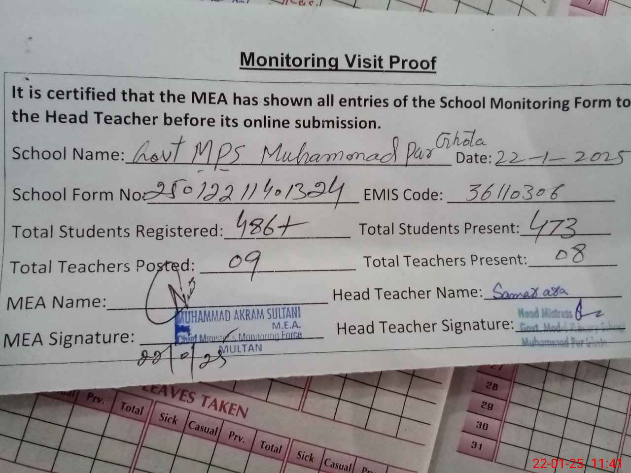 | Attendance Register | Head Teacher | MEA with School | Visit Proof |
