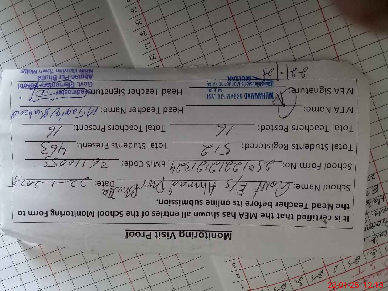 | Attendance Register | Head Teacher | MEA with School | Visit Proof |
