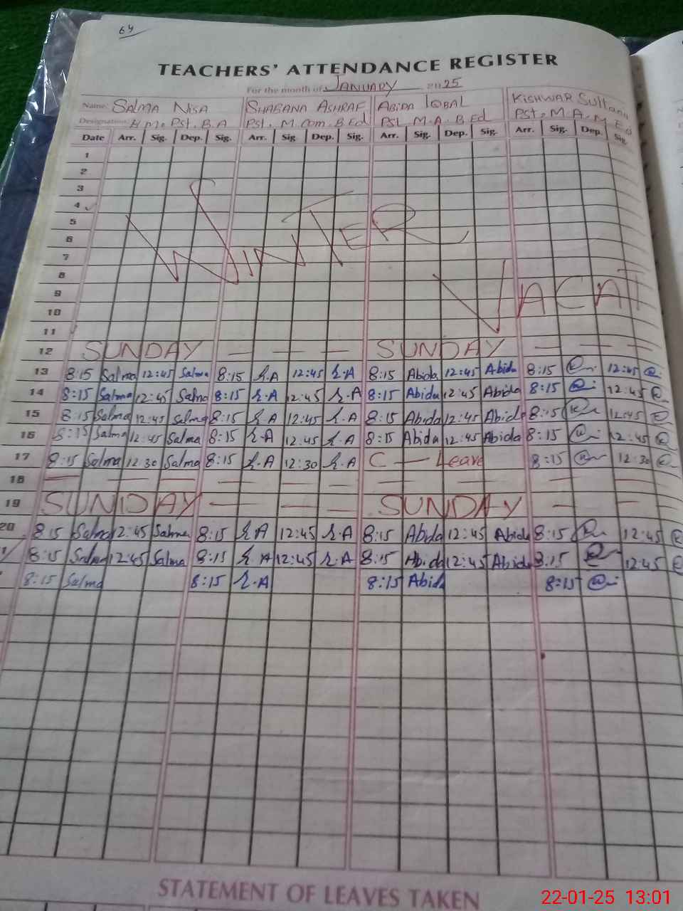 | 61**** | Mu**** Am**** Kh**** | EST(ENGLISH) | Temporary | 0 | 0 | 0 | 0 | 0 | 0 | 0 | 0 | 0 | Absent (Un-Authorized) |