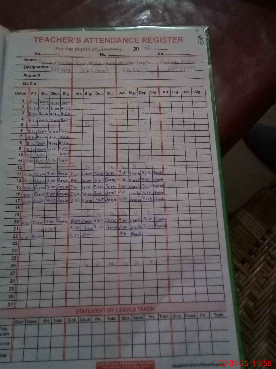 | CNIC | Full Name | Designation | R/C | Absence During Last Calender Month |