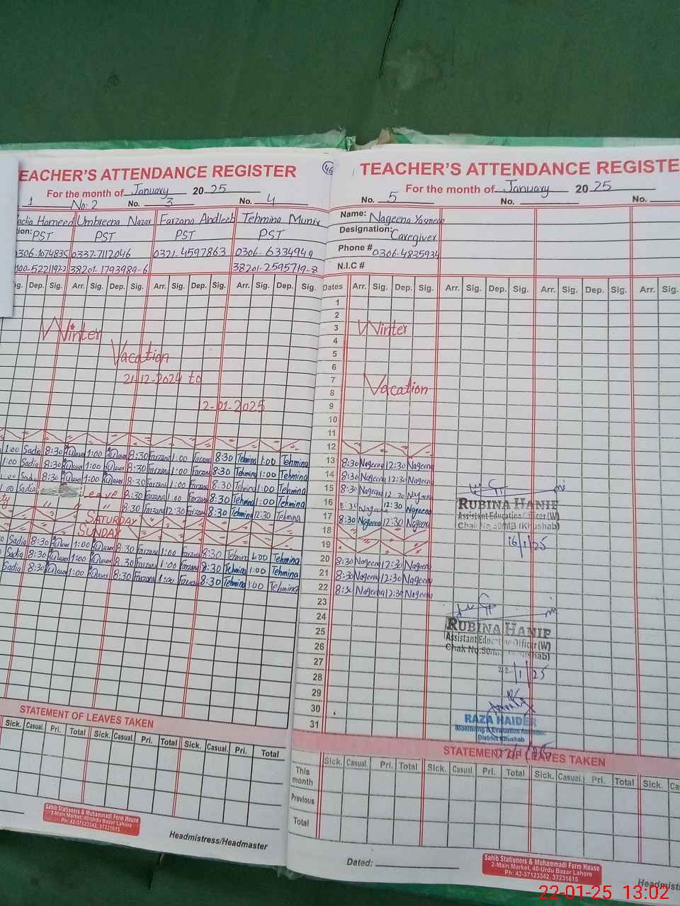 | CNIC | Full Name | Designation | R/C | Absence During Last Calender Month |