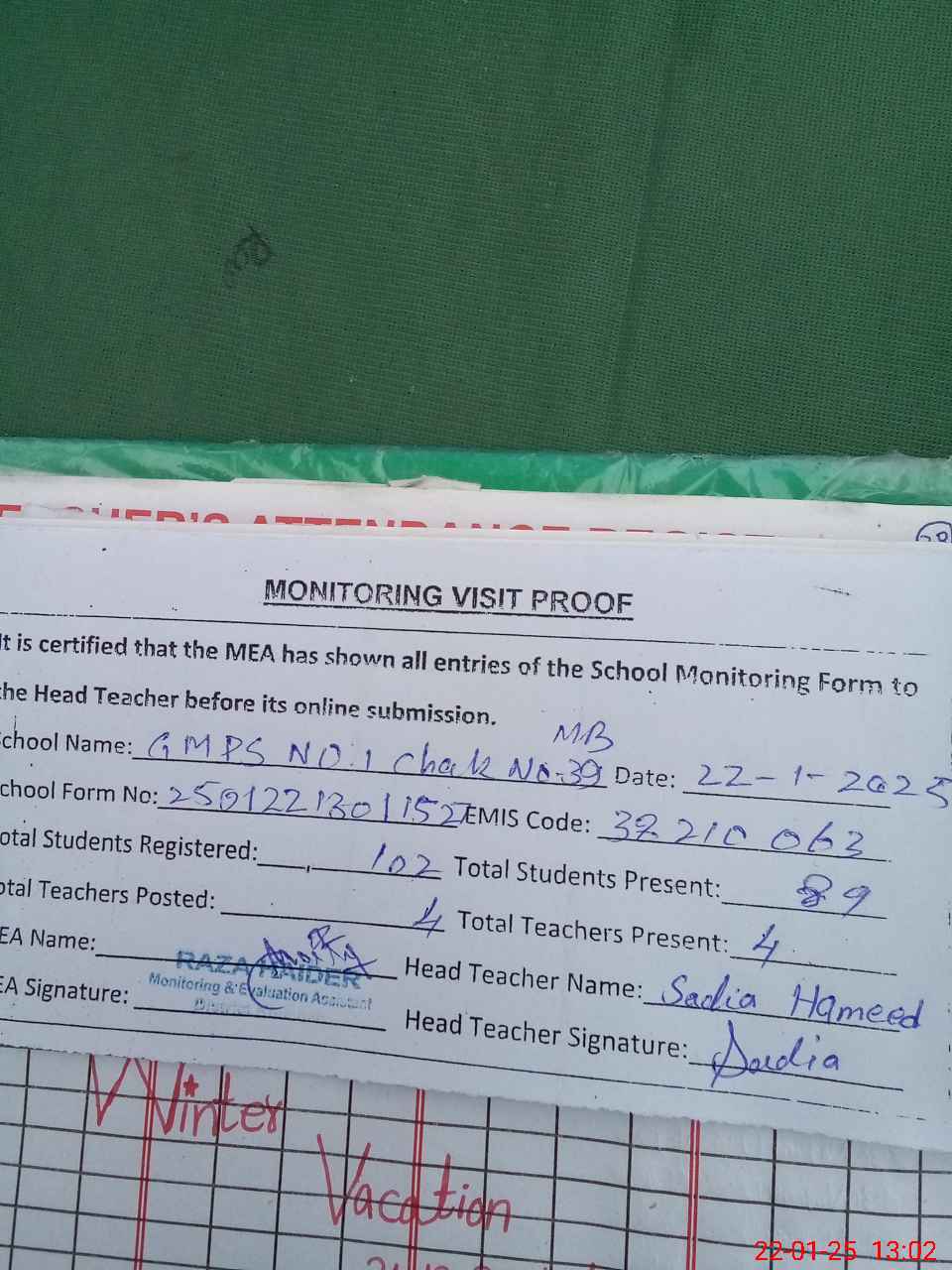 | Attendance Register | Head Teacher | MEA with School | Visit Proof |