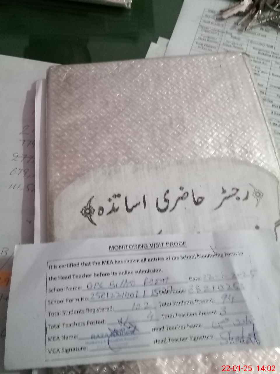 | Attendance Register | Head Teacher | MEA with School | Visit Proof |