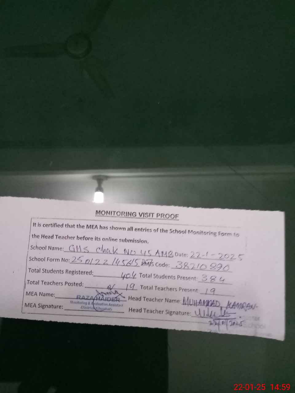 | EMIS Code: 38210890 | Name of School: GHS CHAK NO. 45 AMB | |||