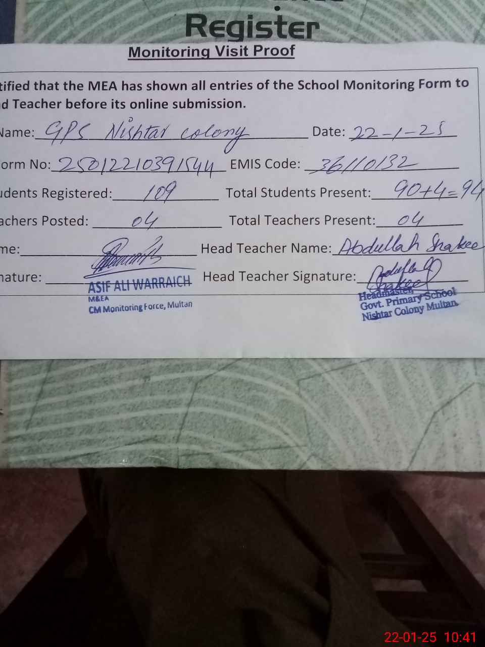 | EMIS Code: 36110132 | Name of School: GPS NISHTAR COLONY MULTAN | |||