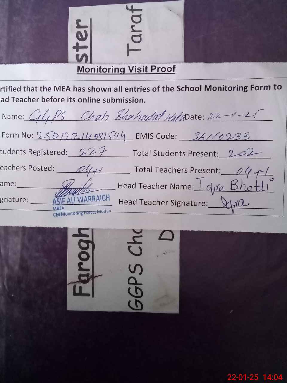 | Attendance Register | Head Teacher | MEA with School | Visit Proof |