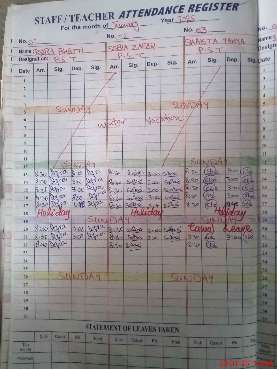 | Leave | Duty | Absent | Maternity | Medical | Ex- Pak |