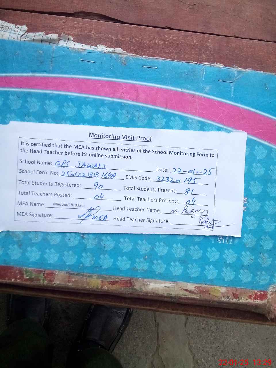 | Attendance Register | Head Teacher | MEA with School | Visit Proof |