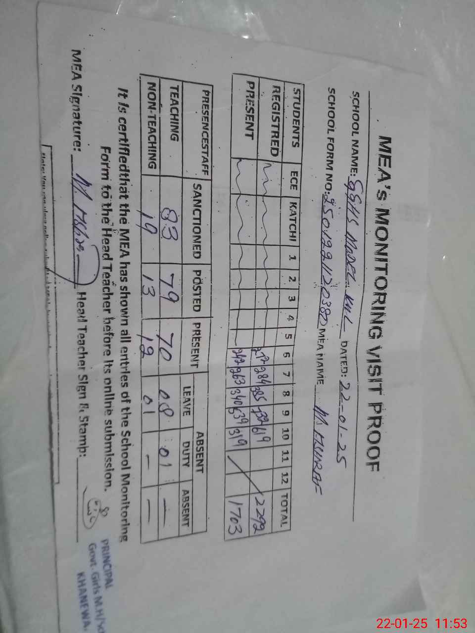 | Attendance Register | Head Teacher | MEA with School | Visit Proof |