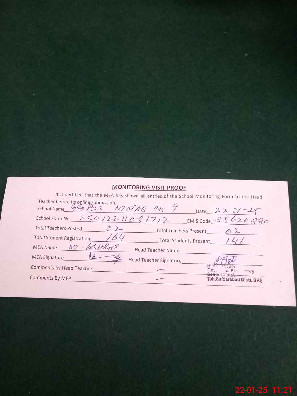 | Attendance Register | Head Teacher | MEA with School | Visit Proof |