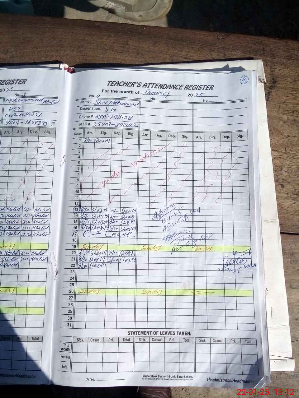 | CNIC | Full Name | Designation | R/C | Absence During Last Calender Month |