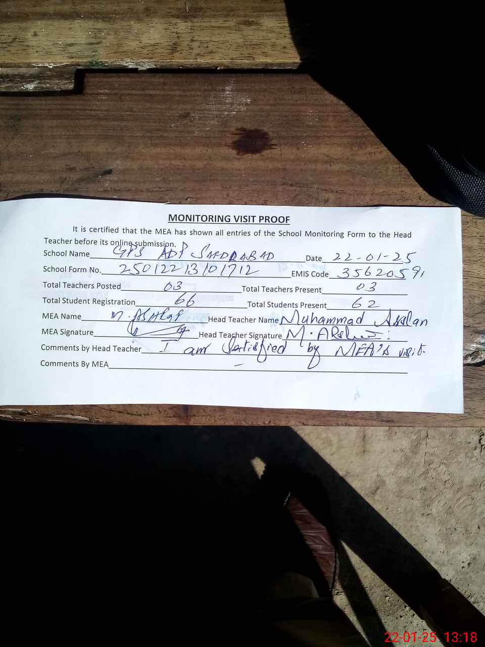 | Attendance Register | Head Teacher | MEA with School | Visit Proof |