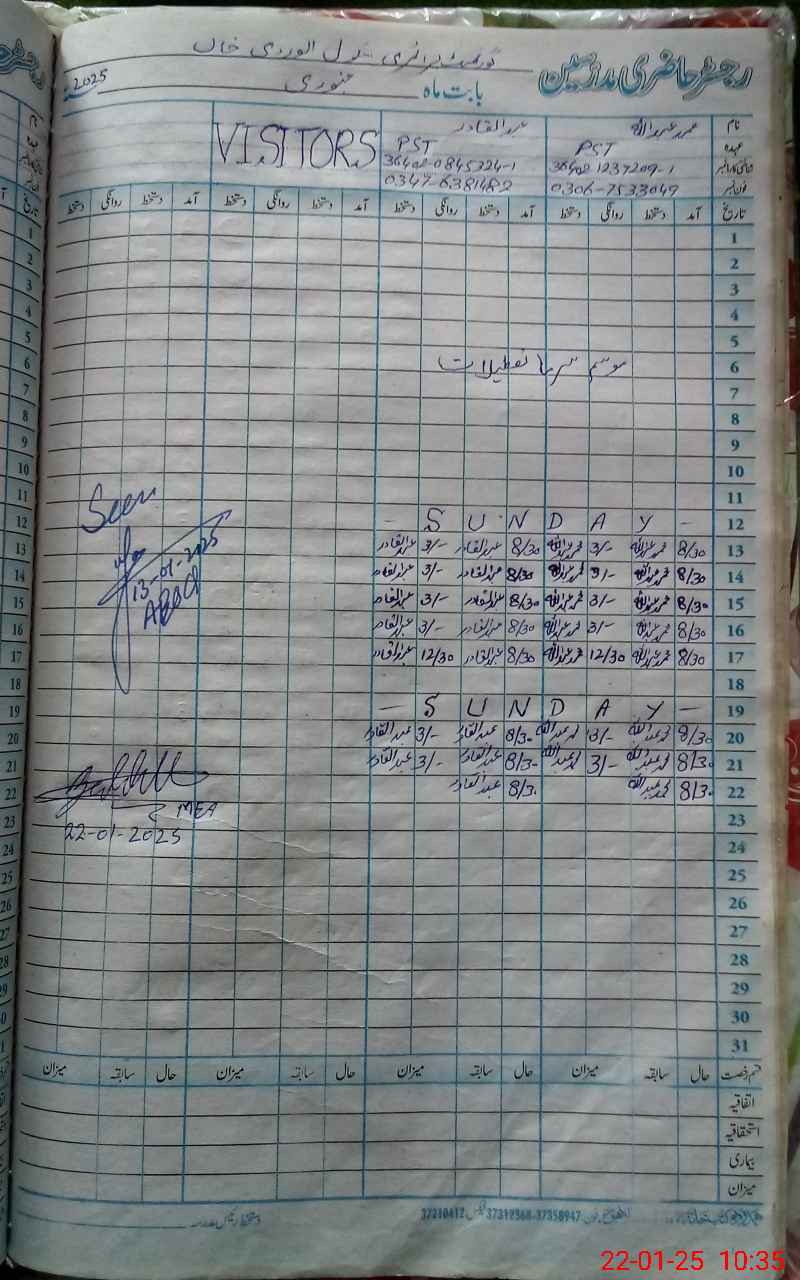 | CNIC | Full Name | Designation | R/C | Absence During Last Calender Month |