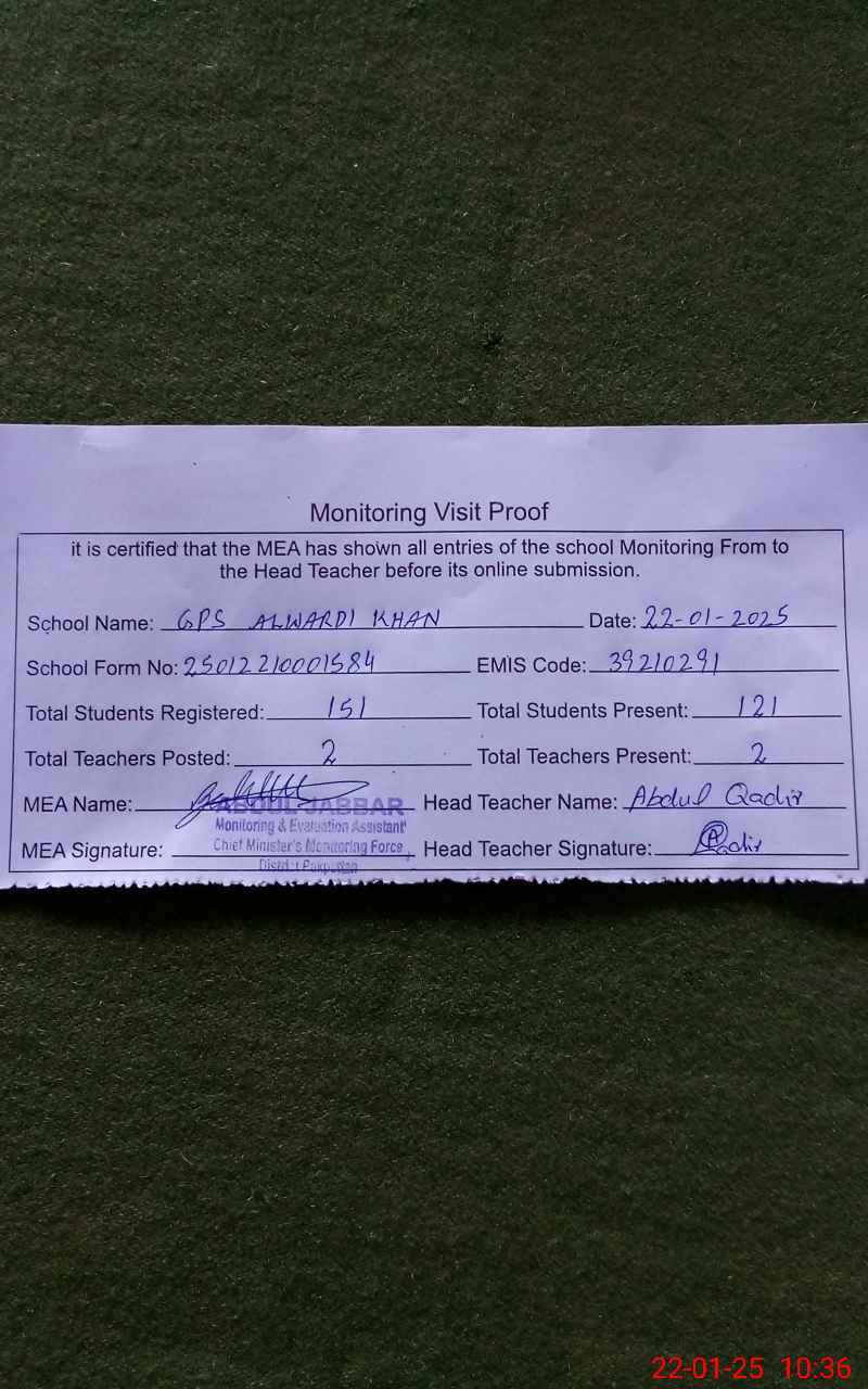 | EMIS Code: 39210291 | Name of School: GPS ALWARDI KHAN | |||