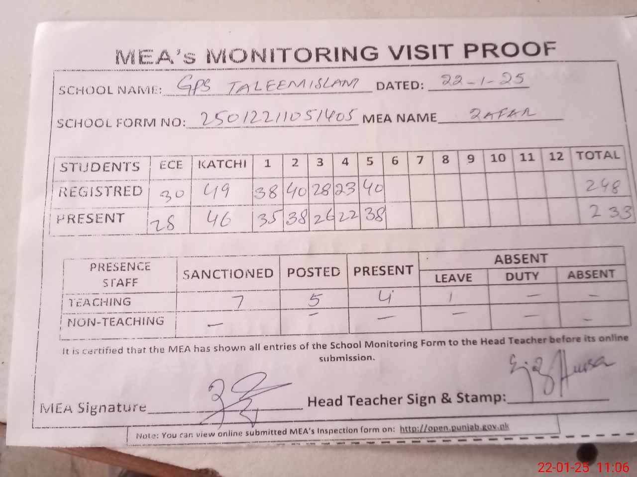 | Attendance Register | Head Teacher | MEA with School | Visit Proof |