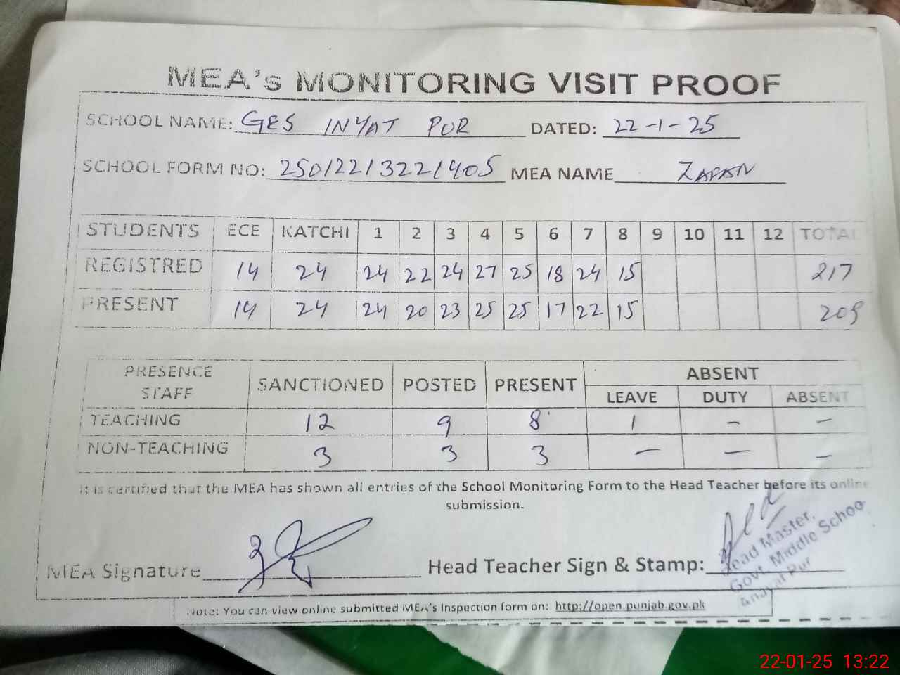 | EMIS Code: 36410055 | Name of School: GES INAYAT PUR, P/O HAJI PUR, KABIRWALA | |||