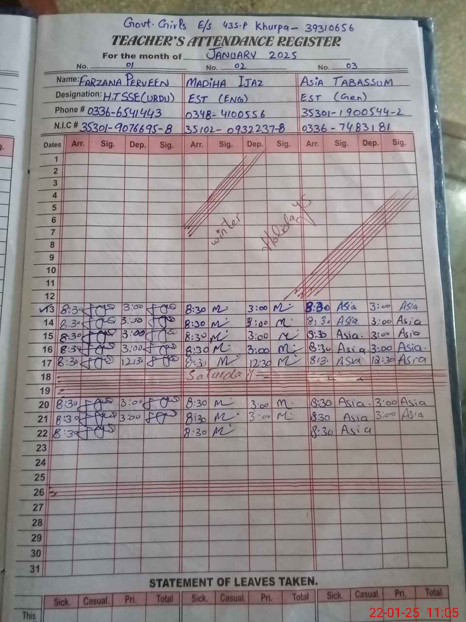 | CNIC | Full Name | Designation | R/C | Absence during last cal. month |