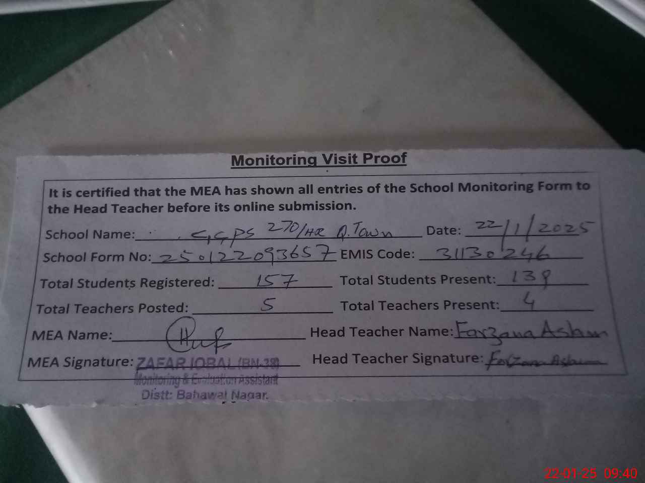 | Attendance Register | Head Teacher | MEA with School | Visit Proof |