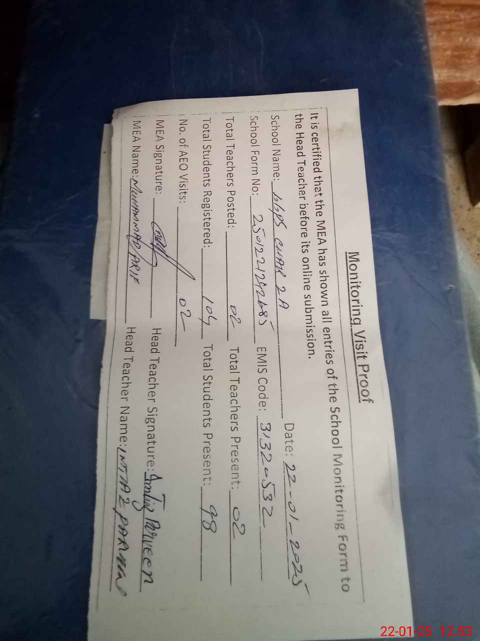 | Attendance Register | Head Teacher | MEA with School | Visit Proof |