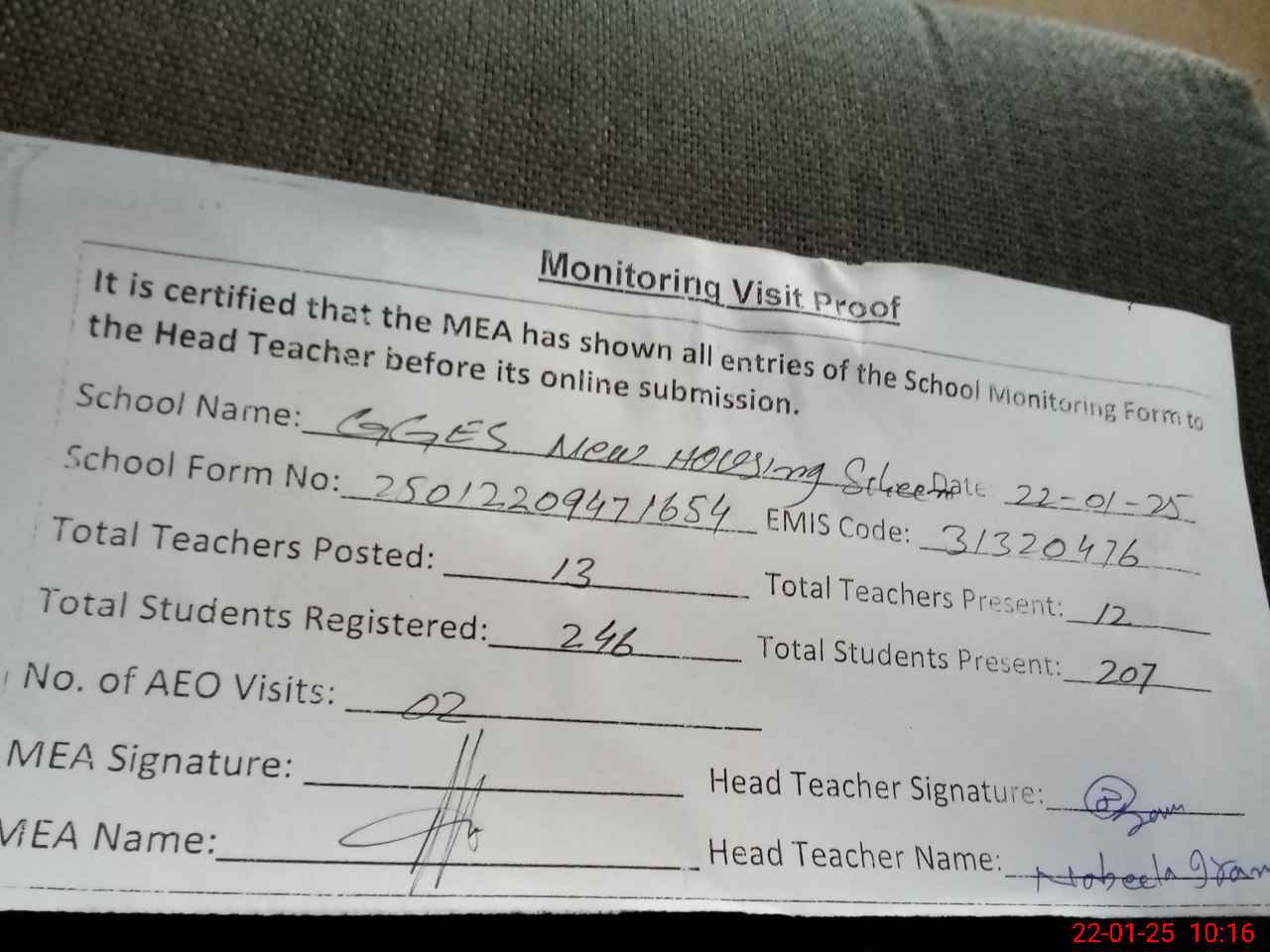 | Attendance Register | Head Teacher | MEA with School | Visit Proof |