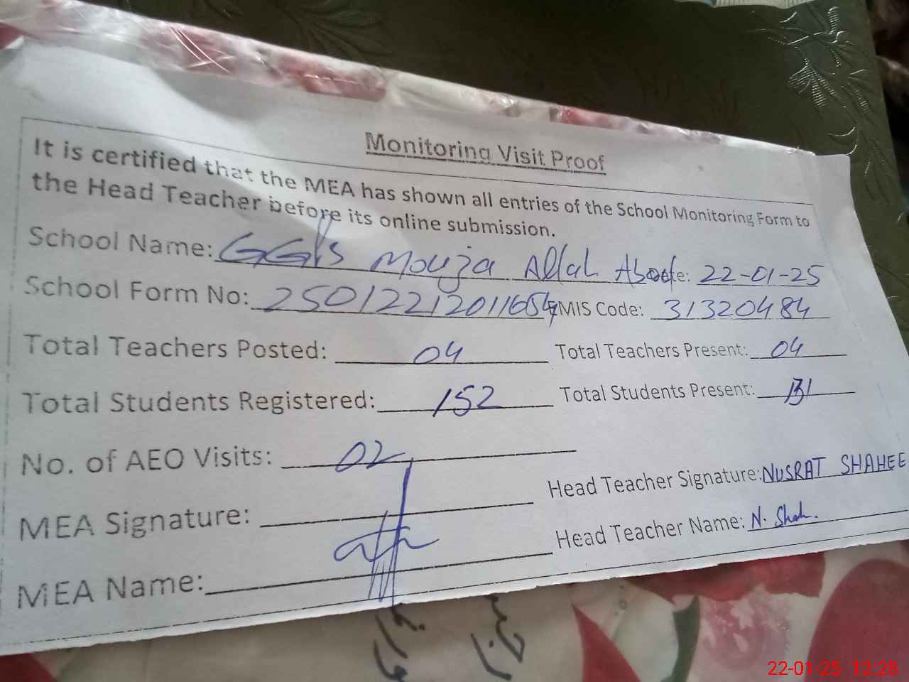 | EMIS Code: 31320484 | Name of School: GGPS MOUZA ALLAH ABAD | |||