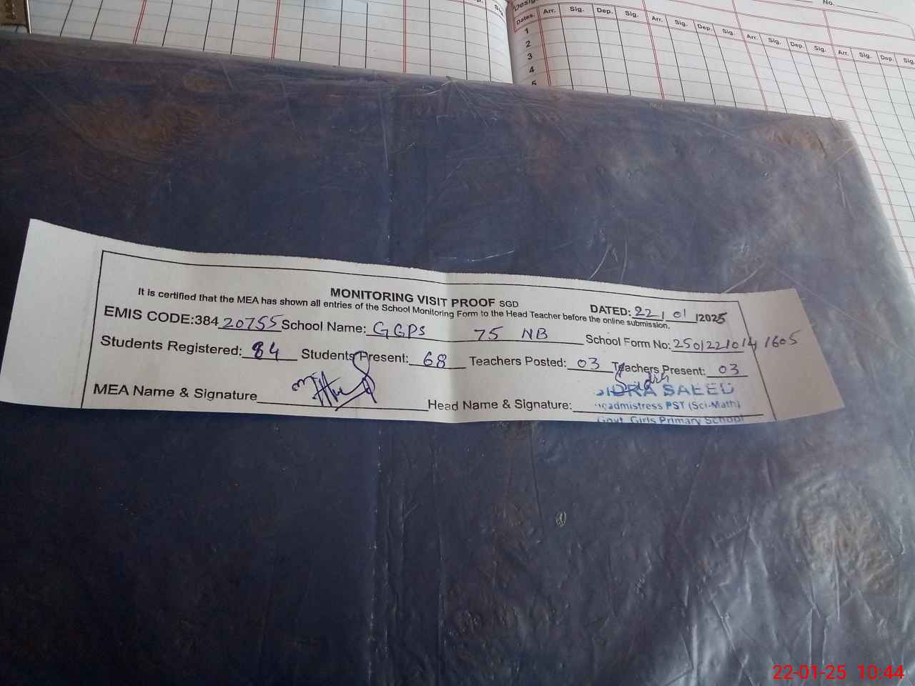 | Attendance Register | Head Teacher | MEA with School | Visit Proof |