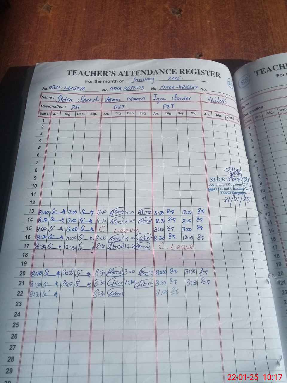 | Name: SI**** SA**** Designation: (School Headmaster's/Headmistress's) PST Phone/Cell Number: 03**** |