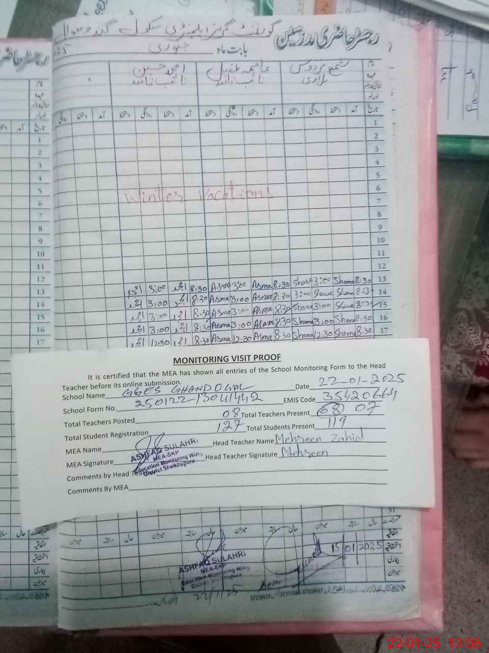 | Attendance Register | Head Teacher | MEA with School | Visit Proof |