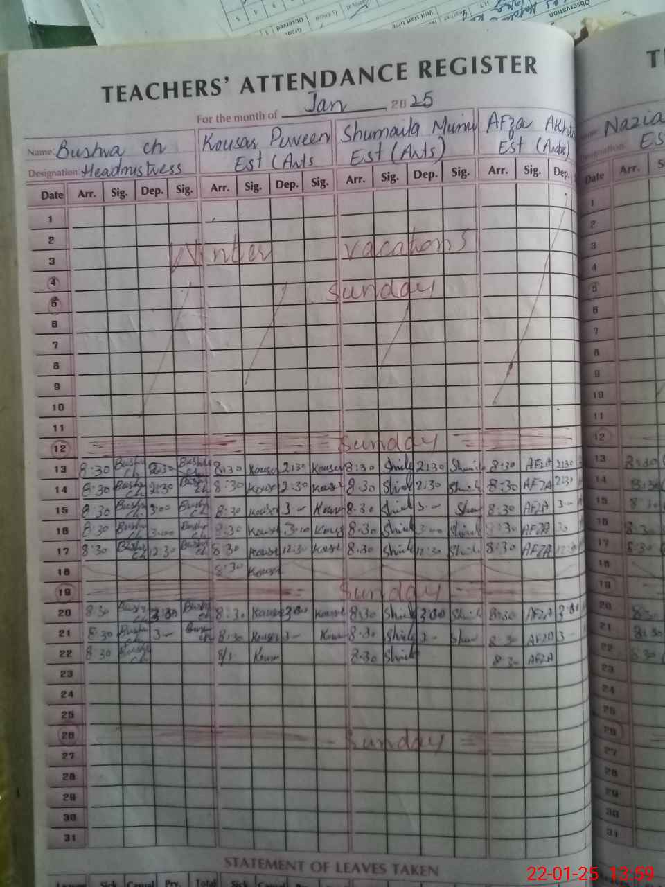 | No. of Students Present - Female | 15 | 0 | 18 | 20 | 14 | 15 | 20 | 25 | 21 | 23 | 27 | 198 | ||||