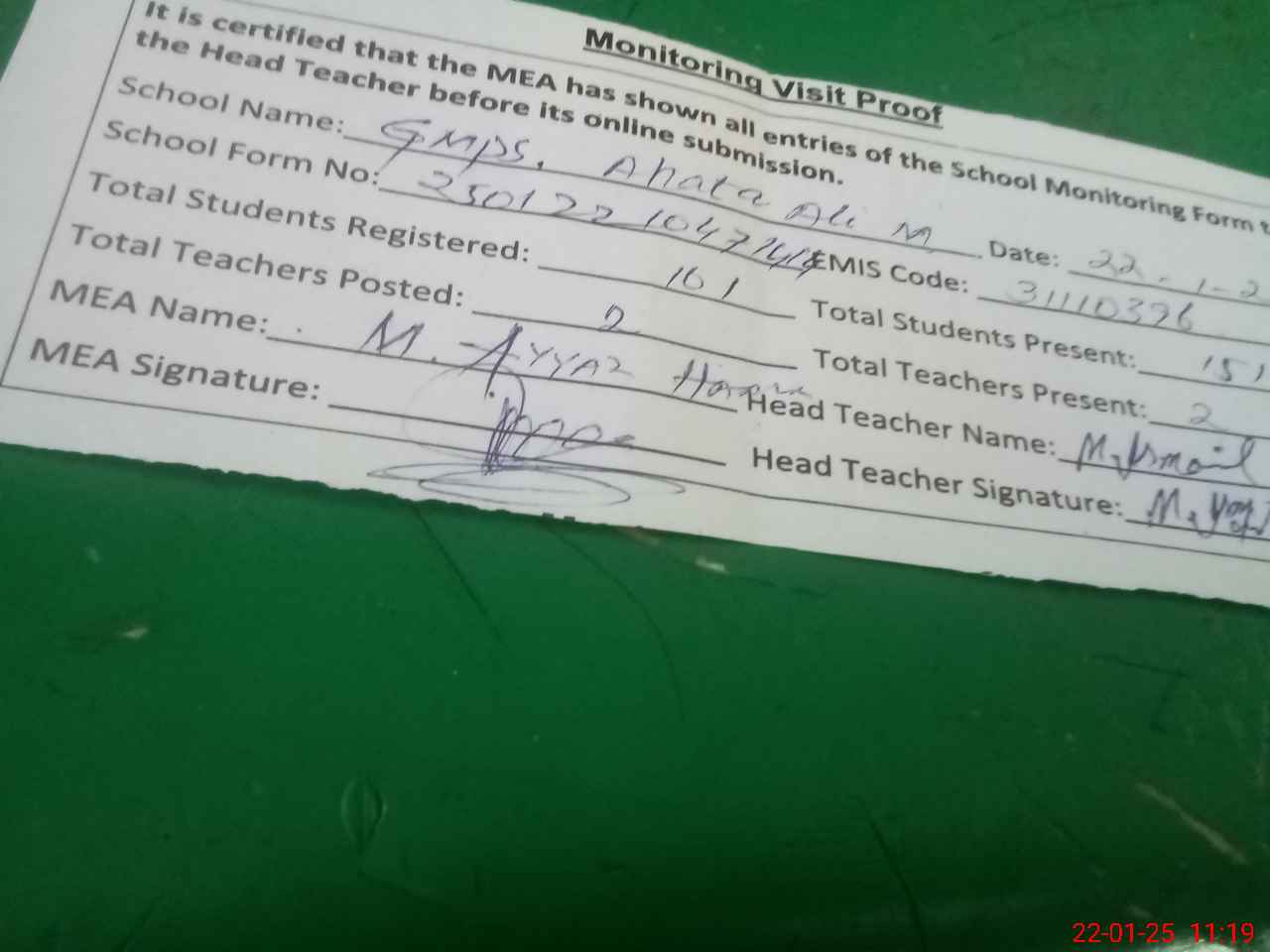 | Attendance Register | Head Teacher | MEA with School | Visit Proof |