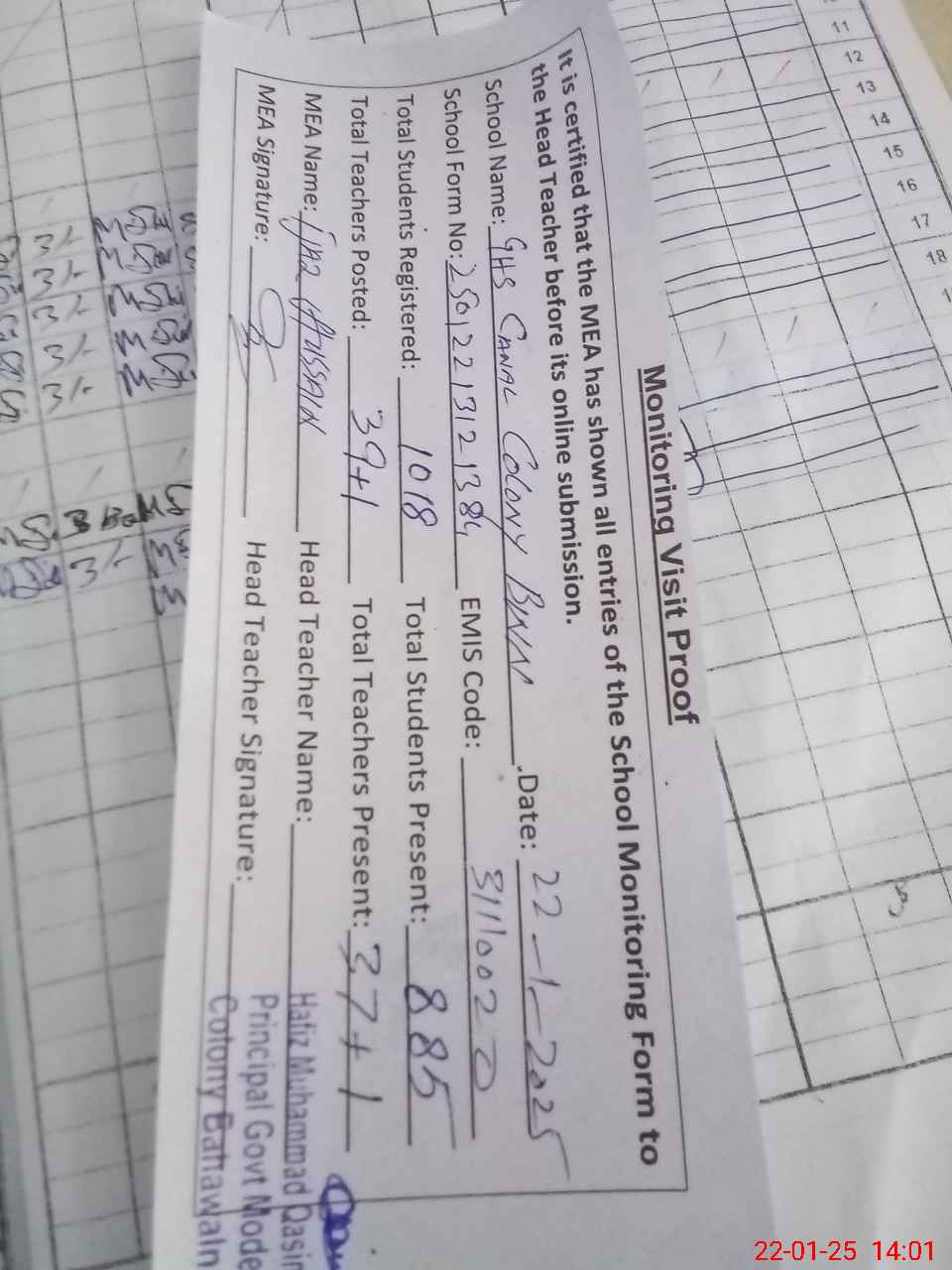 | Attendance Register | Head Teacher | MEA with School | Visit Proof |