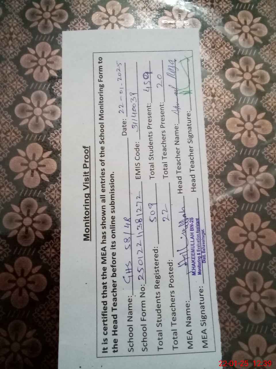 | Attendance Register | Head Teacher | MEA with School | Visit Proof |