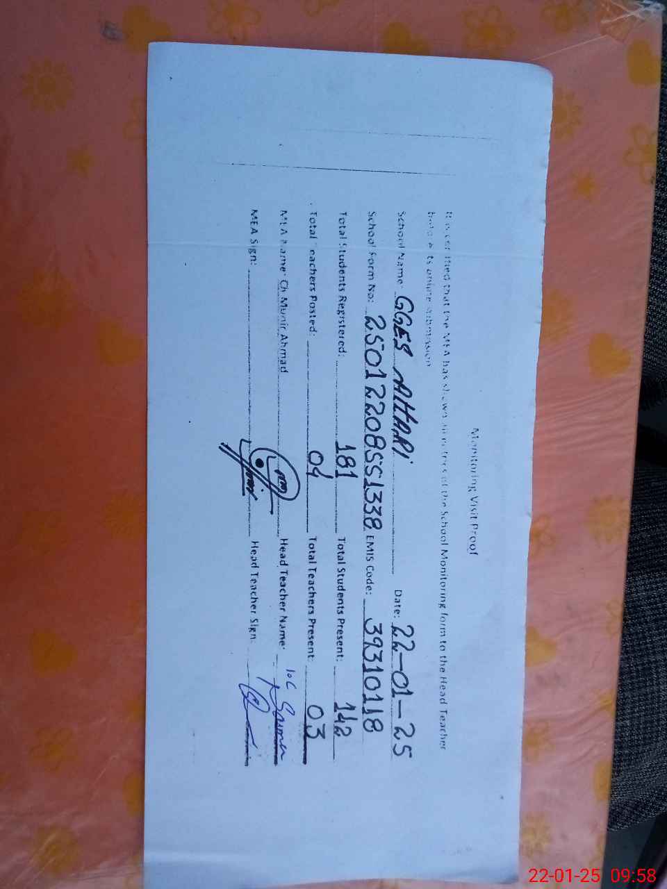 | Attendance Register | Head Teacher | MEA with School | Visit Proof |