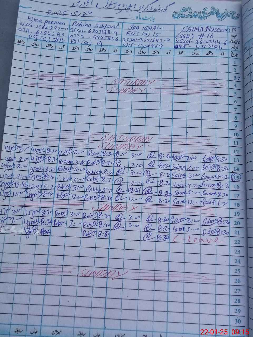 | CNIC | Full Name | Designation | R/C | Absence During Last Calender Month |