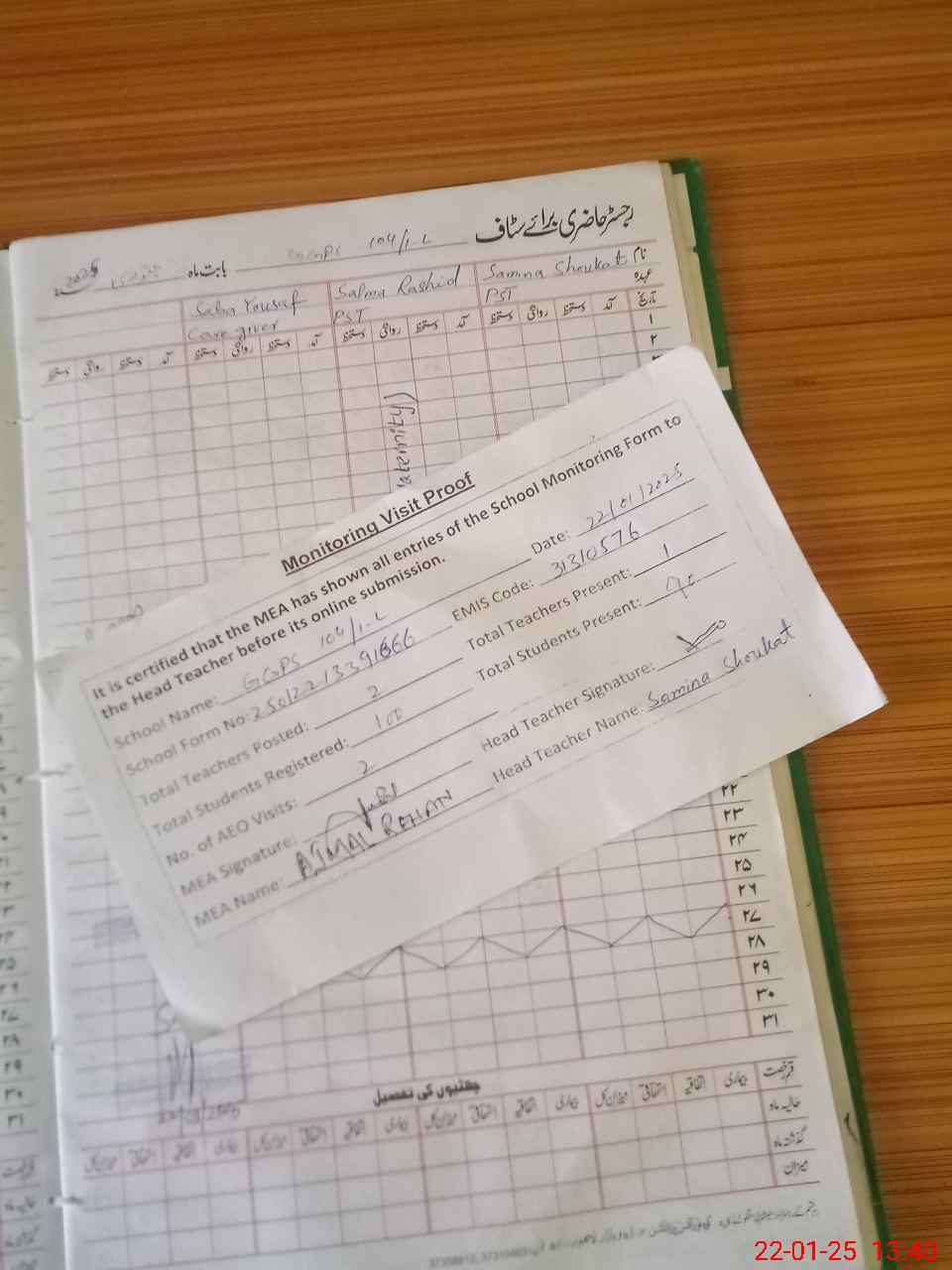 | Attendance Register | Head Teacher | MEA with School | Visit Proof |