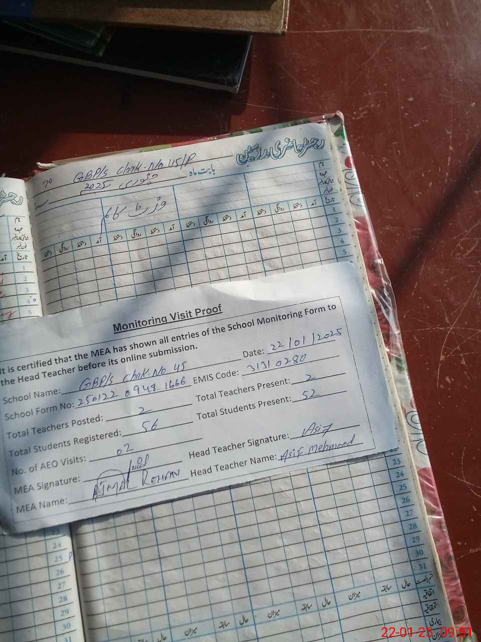 | Attendance Register | Head Teacher | MEA with School | Visit Proof |